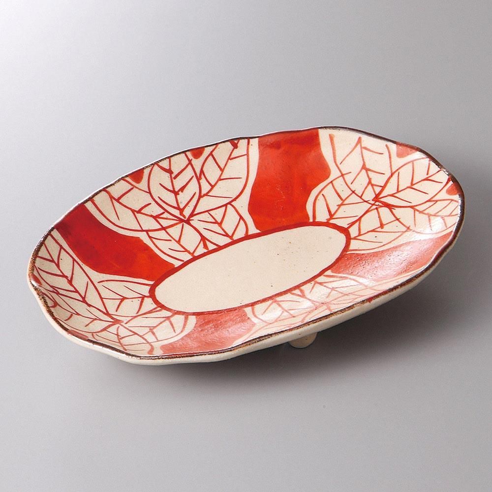391-11-34J みやび街道vol.5 手描き赤ダミ木の葉三ツ足楕円皿 業務用